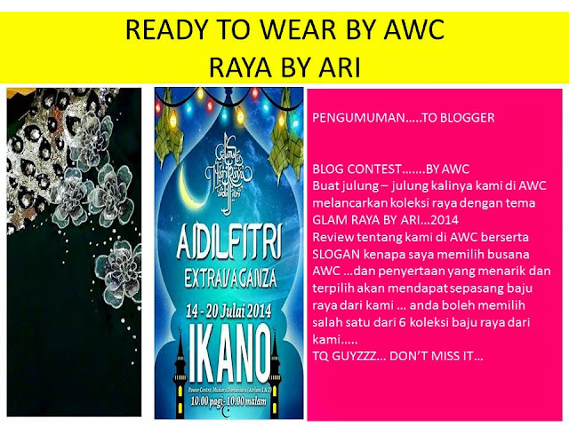 Jangan lepaskan peluang untuk mendapatkan busana ready to wear by ARI untuk digayakan pada 1 Syawal nanti bermula 1 Ramadhan di Kompleks PKNS dan juga IKANO.... READY TO WEAR BY ARI BERTEMAKAN RAYAWEDDING dan didatangkan dalam 3 saiz S/M/L dan pilihan sebanyak 16 warna.....